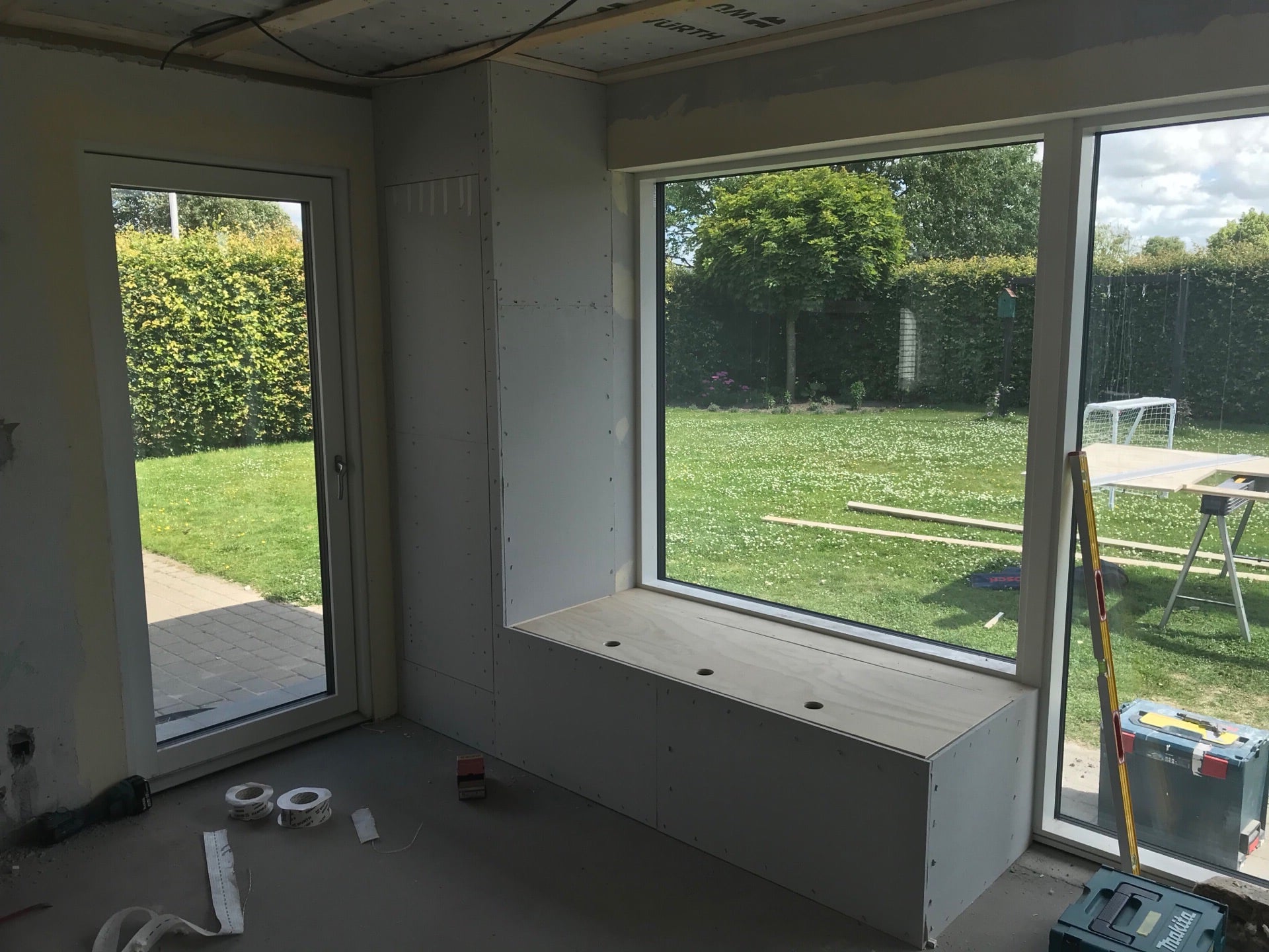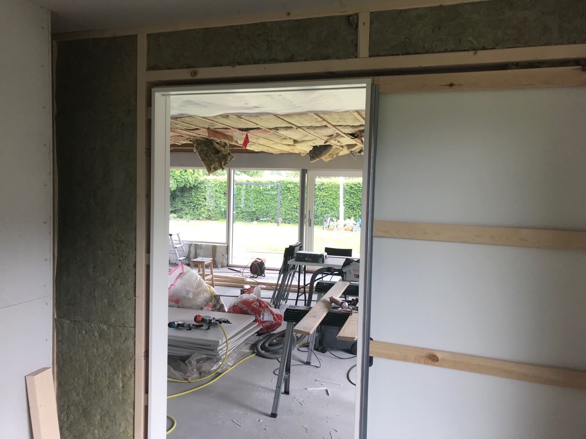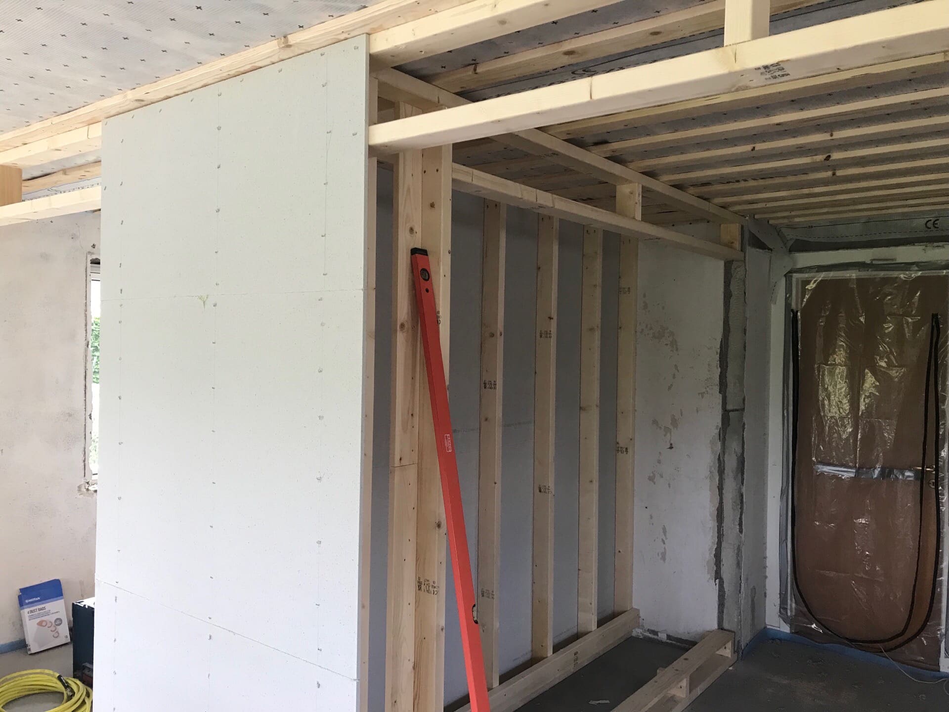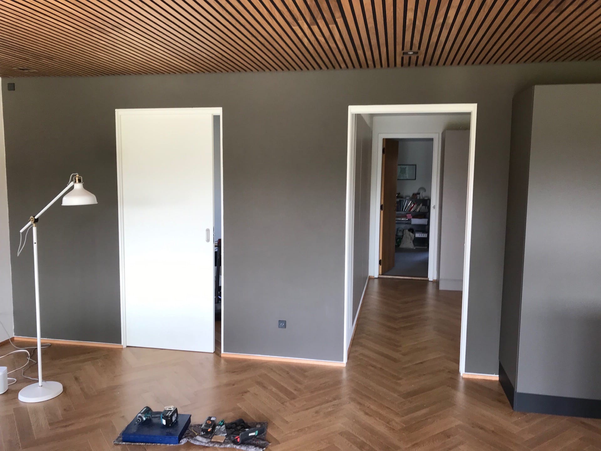 Kunden har selv lagt sildebensgulvet og monteret køkken, jeg har bl.a. hjulpet med nye lofter inkl. dampspærre og forskalling, nye vægge inkl. 2 stk. skydedøre, egetræs fodlister og et skab til installationerne inkl. bænk med opbevaring.
